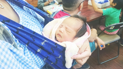 お兄ちゃんといっしょにきてお母さんの胸でとても気持ちよさそうに寝ていました。