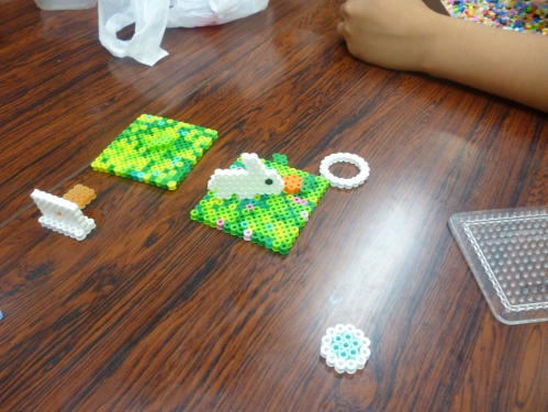 そのビーズを突起の付いた透明の板(3枚目の写真の右端に写っています)に模様を作りながらさしていき、アイロンの熱で溶かして一枚の板状にするのです。