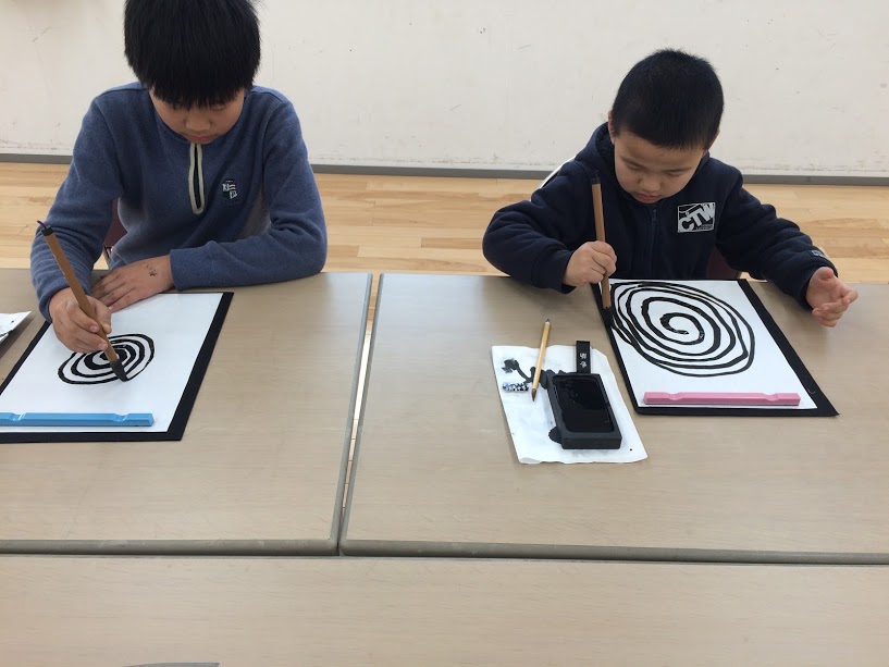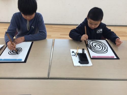 「ぐーるぐるぐる、ぐーるぐるぐる……」駄菓子や「くにちゃん」の書道の時間は、筆となかよくなる時間です。