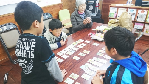 学年の違う子ども達がくにたちカルタで真剣勝負したり、黙々とビーズ細工をしたり。
