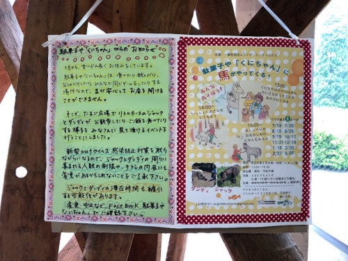 荒天や猛暑などで日程変更がある場合は、駄菓子や「くにちゃん」の前の掲示板とFacebookでお知らせしますね。